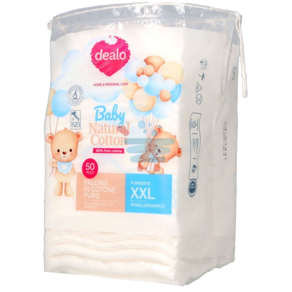 Le Faldine Dealo Baby Natural formato XXL (confezione da 50 pezzi) sono l'alleato perfetto per la cura e l'igiene quotidiana dei più piccoli. Realizzate in puro cotone naturale morbido e super assorbente, sono ideali per detergere delicatamente la pelle sensibile dei neonati durante il cambio pannolino o per la pulizia del viso. Il loro grande formato rettangolare garantisce una pulizia rapida ed efficace, prevenendo arrossamenti e irritazioni.
